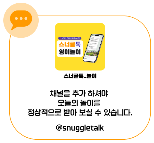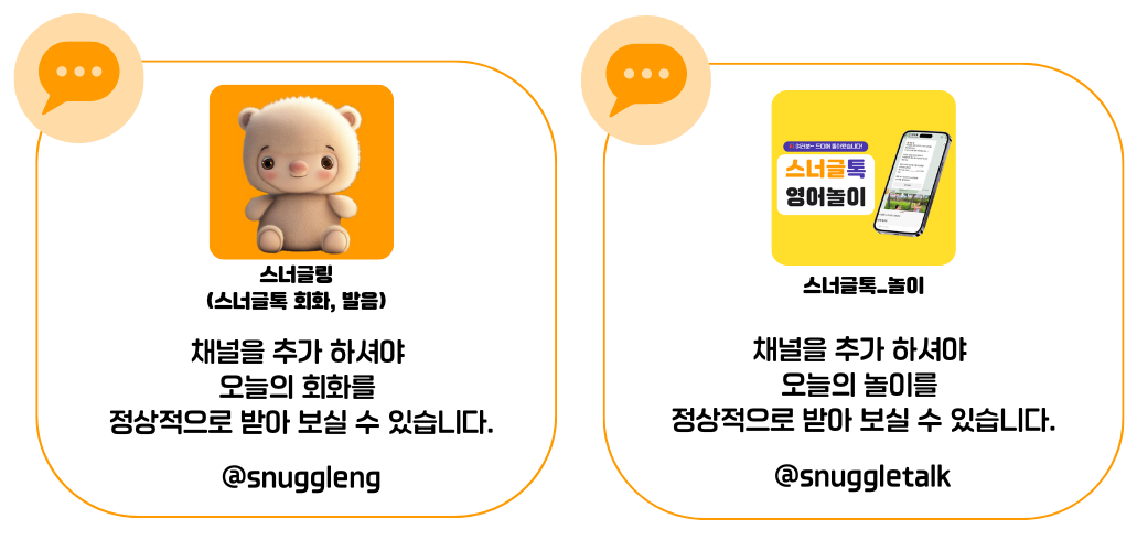 스너글링은 하루에 4~10문장 정도의 표현을 제공하고,그날 받은 문장을 실제로 아이와 함께 말해보는 걸 목표로 만들었습니다. 두 레벨을 모두 받으면 하루 학습량이 많아져 오히려 지치실 수 있어요.